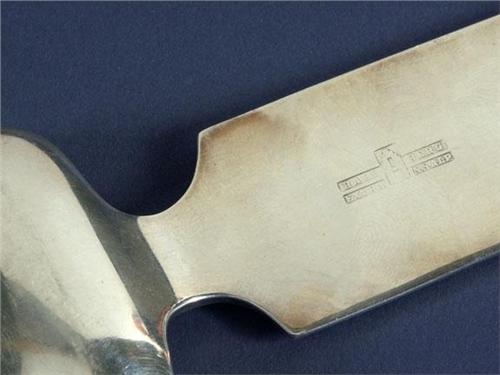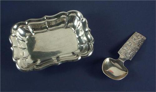 SILVER: A lot of two items, Swedish sauce spoon hallmarked ''Hall Berg Extra NSALP'', having a wide flat handle which there is embossed or molded series of scenes representing different aspects of living in Sweden. It is signed ''L. Deckel'', 5 «'' and a Reed and Barton ''card tray'', ''Windsor patters, x958B, and dated 1947, 7'' x 5'', Note: Light surface scratches