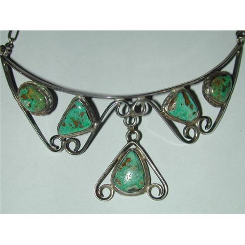 Extremely fine handcrafted sterling turquoise drop necklace! It is intended to lay gracefully across the collar bones...the measurements given are of the ornamental part which does not includ the chain. There are five medium size stones which are of the highest quality turquoise being a brilliant greenish turquoise color with striads of golden color intermixed. this necklace was hand crafted in 1970 or earlier in Wyoming and is so unique...one of a kind! It comes with a matching cuff bracelet which is listed separately. A nice set!
