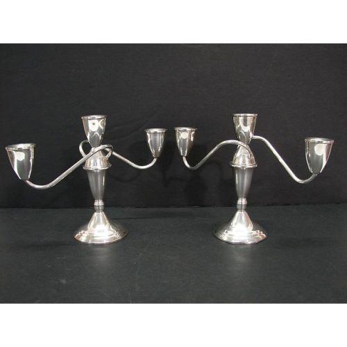 PAIR OF STERLING WEIGHTED TRIPLE CANDELABRAS. Marked on bottom “Duchin Creation”. 7.75” H