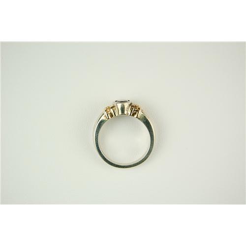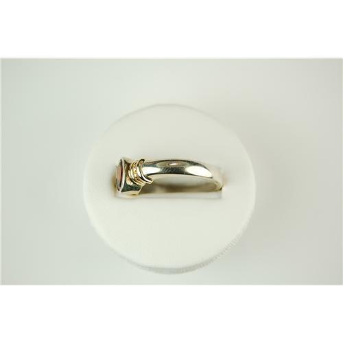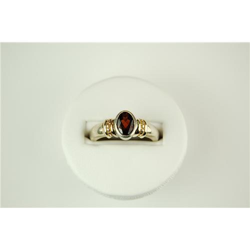 This ring is STERLING SILVER with 14k GOLD accents either side of the oval Genuine GARNET. The GARNET = .50 CARATS! This ring is an 'elegant and simple' style, very easy to wear. The ring is a Size 6 1/2 and it can be resized.
