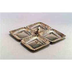 ÖSTERREICH Cabarett, Silber. Cabarett aus vier quadratischen Schalen, mit gemuldeter und gerillter Fahne mit welligem Rand, in der Mitte eine Eichel mit Blättern als Handhabe. 30,5 x 30,5 cm. Unbezeichnet. Um 1900