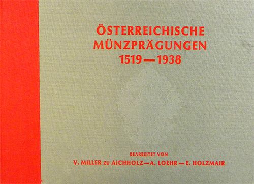 Miller zu Aichholz, V., A. Loehr and E. Holzmair. ÖSTERREICHISCHE MÜNZPRÄGUNGEN 1519-1938. Chicago, 1981 reprint of the second edition. Two volumes. Oblong folio, original gray and red embossed cloth, gilt. (2), xl, 354; 14 pages; 56 plates. Fine. The indispensable standard work, covering the entire range of Austrian numismatics. Clain-Stefanelli 8217*.