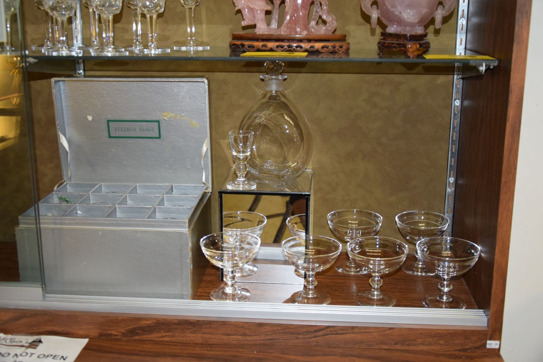 STEUBEN: 8 LIQUOR GLASSES (BOXED), 6 CHAMPAGNE GLASSES & ORREFORS DECANTER (15 PCS)