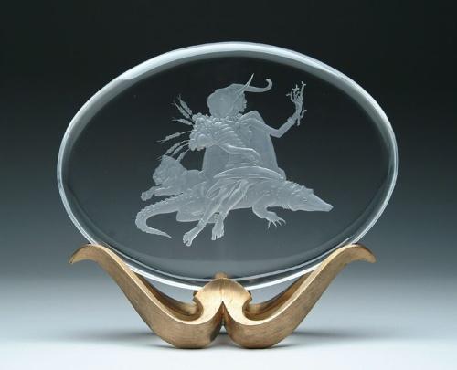 STEUBEN AFRICAN SCULPTURE. Very rare elaborately wheelcarved pattern depicts African maiden with elephant headdress sitting on top of a crocodile with a lion in the background. All engraved in a flawless crystal oval. Designed by Don Wier and Lloyd Atkins in 1962. The piece is a part of a series of four. Oval comes resting on a heavy gold metal base and is complete with red leather presentation case. Pictured on pg. 303 of the new Madigan book "Steuben Glass: An American Tradition in Crystal". SIZE: 11-1/2 in. l. CONDITION: Very good to excellent. 5-61141