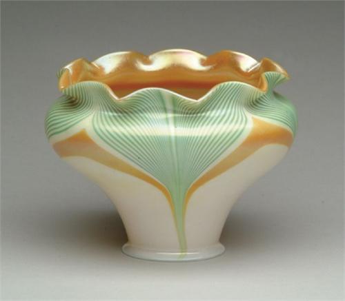 STEUBEN ART GLASS SHADE. Same as the previous lot on a creamy white opal ground. Remnants of Fleur de Lis mark on fitter. SIZE: 4-1/4 in. t. CONDITION: Chip to fitter rim, otherwise very good to excellent. 5-61622