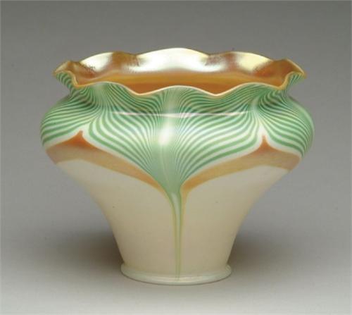 STEUBEN ART GLASS SHADE. Same as the previous lot on creamy yellow opal ground. Remnants of Fleur de Lis mark on fitter. SIZE: 4-1/4 in. t. CONDITION: Chip to fitter rim, otherwise very good to excellent. 5-61623