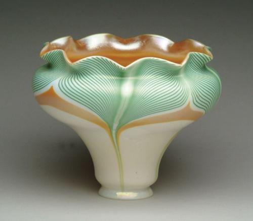 STEUBEN ART GLASS SHADE. Large Steuben art glass shade matching the previous lots except in the larger size. Remnants of Fleur de Lis mark on fitter. SIZE: 6 in. t. CONDITION: Minor chips to rim, otherwise very good to excellent. 5-61625