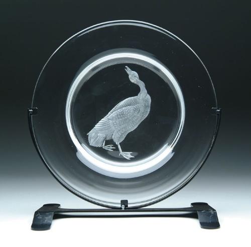 STEUBEN AUDUBON PLATE. Wonderful crystal plate is copper wheel engraved with Canadian Goose. Plate is from a series of 21 birds produced on the late 1940's and 1950's. Each bird is an exact replica of the Audubon bird. Plate comes with black metal stand. Pictured on pg. 265 of the new Madigan book "Steuben Glass: An American Tradition in Crystal". SIZE: 10 in. dia. CONDITION: Very good to excellent. 5-61150