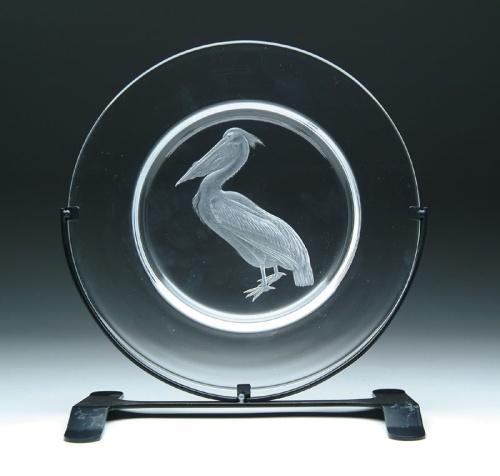 STEUBEN AUDUBON PLATE. Wonderful crystal plate is copper wheel engraved with White Pelican. Plate is from a series of 21 birds produced on the late 1940's and 1950's. Each bird is an exact replica of the Audubon bird. Plate comes with black metal stand. Pictured on pg. 265 of the new Madigan book "Steuben Glass: An American Tradition in Crystal". SIZE: 10 in. dia. CONDITION: Very good to excellent. 5-61151