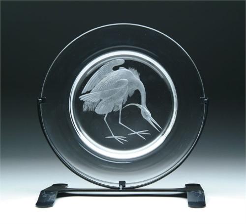 STEUBEN AUDUBON PLATE. Wonderful crystal plate is copper wheel engraved with Great Blue Heron. Plate is from a series of 21 birds produced on the late 1940's and 1950's. Each bird is an exact replica of the Audubon bird. Plate comes with black metal stand. Pictured on pg. 265 of the new Madigan book "Steuben Glass: An American Tradition in Crystal". SIZE: 10 in. dia. CONDITION: Very good to excellent. 5-61152