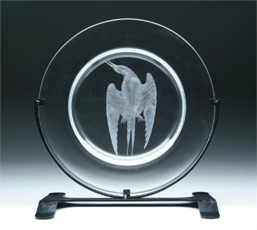 STEUBEN AUDUBON PLATE. Wonderful crystal plate is copper wheel engraved with Artic Tern. Plate is from a series of 21 birds produced on the late 1940's and 1950's. Each bird is an exact replica of the Audubon bird. Plate comes with black metal stand. Pictured on pg. 265 of the new Madigan book "Steuben Glass: An American Tradition in Crystal". SIZE: 10 in. dia. CONDITION: Very good to excellent. 5-61154