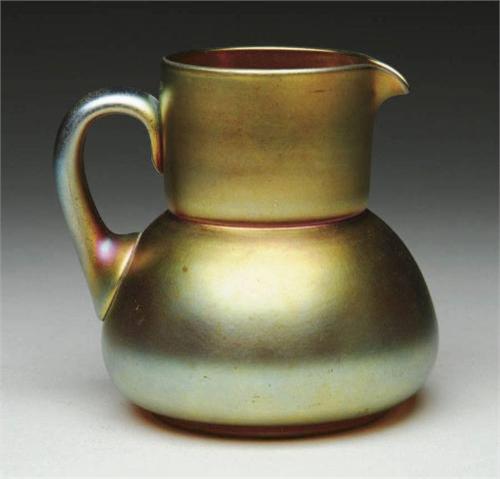 STEUBEN AURENE PITCHER. Nice Steuben pitcher is iridescent gold aurene with an applied handle. Signed on underside "Aurene 2064". SIZE: 5" t. CONDITION: Chip to rim, otherwise very good. 5-68719