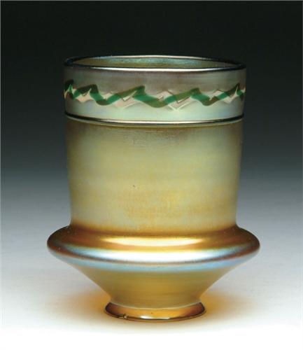 STEUBEN AURENE SHADE. Iridescent gold Aurene finish with an intarsia border. Signed with Steuben Fleur de Lis mark. SIZE: 5-1/2 in. t x 2-1/4 in. fitter. CONDITION: Rim chips to fitter, otherwise very good to excellent. Estate of Jon Heiden and Donald Mooers 5-60689