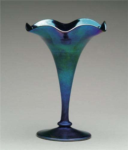 STEUBEN AURENE VASE. Spectacular blue Aurene vase has flaring mouth with ruffled edge and fantastic blue iridescence with strong overtones of gold, purple and green. Interior of vase is almost mirror-like in its finish. Signed on the underside "Aurene 346". SIZE: 8-1/4 in. t x 6 in. dia. CONDITION: Very good to excellent. 5-61573