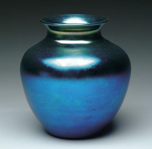 STEUBEN BLUE AURENE VASE. Spectacular Steuben Aurene vase has iridescent blue coloring with gold highlights, flaring rim. Signed on base "Steuben Aurene 2605 (?)". SIZE: 8 in. t. CONDITION: Very good to excellent. 5-60719