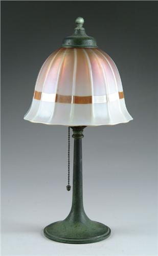 STEUBEN BOUDOIR LAMP. Outstanding Steuben shade has gold iridescence at the top shading to white at the bottom and is decorated with a gold iridescent ribbon band. Shade has vertical ribbing and a rich gold iridescent interior. All iridescence has wonderful blue and red flashes. Shade rests atop a simple metal base with green patina. SIZE: Shade is 8 in. dia. Overall height is 15-1/2 in. CONDITION: Wear to patina on base, otherwise very good to excellent. 5-61459