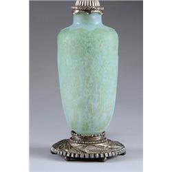 Lot 325 STEUBEN CLUTHERA ACID CUT BACK LAMP BASE Wonderful Steuben lamp base has cream colored acid cut back design of wheat and stems against a light green cluthera background. The acid cut back design encircles the entire base and is mounted on a silver plated foot with raised wheat design matching the acid cut design. SIZE: 26-1/2” t to top of socket. CONDITION: Chip to end of one leaf in acid cut back design, otherwise very good. 5-70917