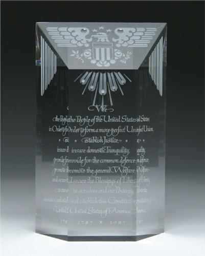 STEUBEN CONSTITUTION BICENTENNIAL PRISM. Stately bicentennial prism is engraved with the Preamble to the Constitution of the United States. The prism was introduced in 1987 for the 200th Anniversary of the Constitution. It is a limited edition and comes with original red leather presentation case. Pictured on pg. 310 of the new Madigan book "Steuben Glass: An American Tradition in Crystal". SIZE: 9 in. t. CONDITION: Very good to excellent. 5-61147