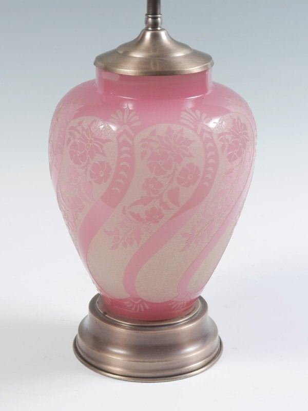 STEUBEN CUT BACK ROSALINE & ALABASTER LAMP: Repeating floral pattern rosaline acid cut to alabaster art glass body, metal base and cap. Double socket fixture, overall 25 1/2'' h. x 7''.
