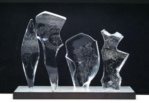 STEUBEN FOUR SEASONS SCULPTURE. This wonderful and rare four seasons sculpture was designed by Donald Pollard and Jacob Landau in 1960. The sculpture has a definite modernism look and feel. Four separate panels set into a wooden framed Lucite base. It is believed that this is the only sculpture of this pattern produced by Steuben. Sculpture comes with a 2002 appraisal from Steuben listing it as a limited edition of 1 and discontinued. Pictured on pg. 286 of the new Madigan book "Steuben Glass: An American Tradition in Crystal". Comes with original gray Steuben presentation box with original key. SIZE: 11-1/4 in. w. CONDITION: Very good to excellent. 5-61140