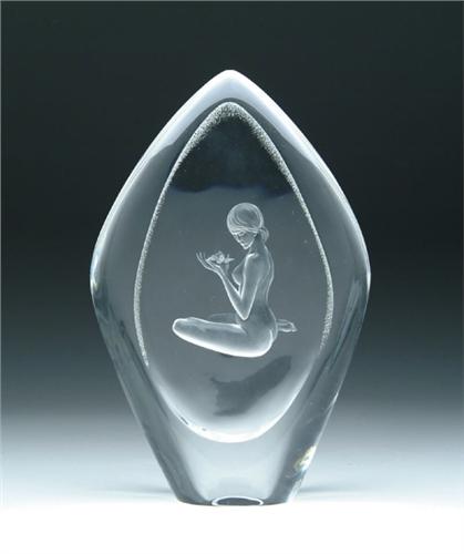 STEUBEN GIRL WITH BIRD SCULPTURE. Designed by George Thompson and Tom Vincent. The diamond shaped form of solid crystal is engraved with a luminous figure of a young girl holding a bird with a broken wing. A misty veil shelters the figures within the crystal. Limited to an edition of 20, this is #18. Comes complete with Steuben red leather binder and red leather presentation case. Pictured on pg. 297 of the new Madigan book "Steuben Glass: An American Tradition in Crystal". SIZE: 10-1/4 in. t. CONDITION: Very good to excellent. 5-61136