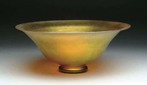 STEUBEN GOLD AURENE BOWL. Wonderful large Steuben bowl features iridescent gold coloring with blue and purple highlights. Bowl retains original Steuben label and is signed "Aurene 2831". SIZE: 12-3/4 in. dia. CONDITION: Very minor interior scratches, otherwise very good to excellent. 5-60820
