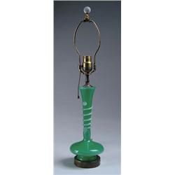 Lot 328 STEUBEN GREEN JADE LAMP BASE Beautiful green jade base is decorated with an applied coil of alabaster glass. Glass lamp base rests on a metal disk foot which may have been added later. SIZE: 12” t to top of glass. 23-3/4” to top of finial. CONDITION: Very good to excellent. 5-70322