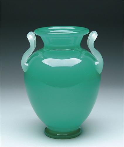 STEUBEN GREEN JADE VASE. Striking green jade urn shaped vase has two applied decorative alabaster handles. SIZE: 10 in. t. CONDITION: Very good to excellent. 5-61005