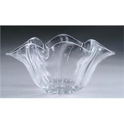 Lot 377 STEUBEN GROTESQUE CENTER BOWL Large, crystal clear, grotesque shaped vase signed "Steuben". SIZE: 6-1/2” t x 13” w. CONDITION: Very good. 5-70332