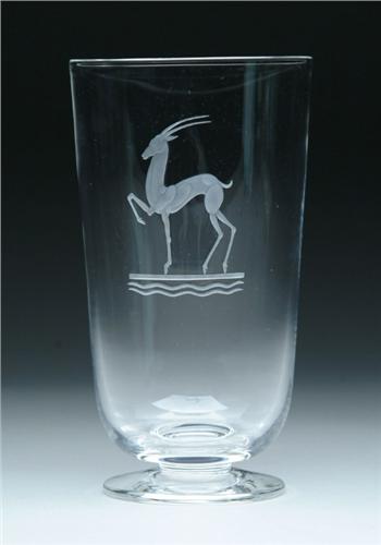 STEUBEN HERITAGE GAZELLE VASE. This vase was designed by Sidney Waugh in the 1930's but was produced in 1989. Vase has a delicate thin wall and is copper wheel engraved with a graceful gazelle. The original production was part of the acclaimed Steuben display at the 1939 World's Fair. This reissue was in commemoration of the 50th Anniversary of the Fair. Pictured on pg. 298 of the new Madigan book "Steuben Glass: An American Tradition in Crystal". Comes with Steuben red leather binder and original red leather presentation box. SIZE: 7-1/2 in. t. CONDITION: Very good to excellent. 5-61139