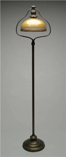 STEUBEN INTARSIA FLOOR LAMP. Floor lamp begins with a brown (orange) aurene on calcite shade with intarsia decorated border. Shade is supported by a harp-style base of simple mission form. Shade has remnants of “Steuben” signature. SIZE: Shade is 10" dia with 2-1/4” fitter. Overall height is 58". CONDITION: Shade is very good to excellent. Base is rough with heavy oxidation and is missing small pieces. 5-61637