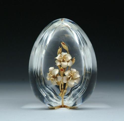 STEUBEN LILIES SCULPTURE. Wonderful crystal sculpture depicts egg sliced open to reveal a cluster of gold lilies, their petals glazed with translucent white enamel. The egg rests on a slender three quarter ring of gold. Designed by Donald Pollard. Comes with original Steuben red leather presentation box. SIZE: 5 in. t. CONDITION: Very good to excellent. 5-61144