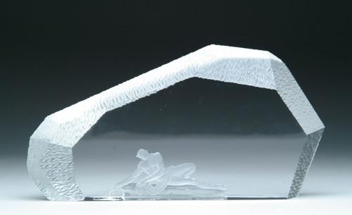 STEUBEN NARCISSUS SCULPTURE. Fantastic crystal sculpture has figure of Narcissus reclining at a pool with finger touching the water. Designed by Sidney Waugh in 1962. Sculpture comes with original leather presentation case and is shown on pg. 301 of the new Madigan book "Steuben Glass: An American Tradition in Crystal". SIZE: 11 in. l. CONDITION: Very good to excellent. 5-61134