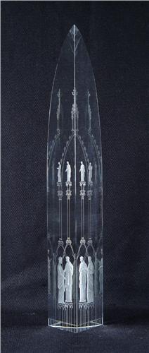 STEUBEN PRESENTATION SCULPTURE. Exceptionally fine Steuben crystal sculpture entitled "Cathedral" by George Thompson 1955 is triangular form in the shape of a tall cathedral. Carved into each of the three sides is a wonderfully detailed robed man standing atop a column. The columns continue upward and again support a carved figure, this time of a robed woman. The wonderful carving and etching on each of the three sides gives the sculpture an outstanding three dimensional effect. Signed on the bottom in script "Steuben". The piece is housed in its original presentation box with red leather exterior and red velvet and satin interior. Piece is pictured in the "Steuben Glass Holiday 2004" catalog and is priced at $23,000. SIZE: 16 in. t. CONDITION: Very good to excellent. 5-71278