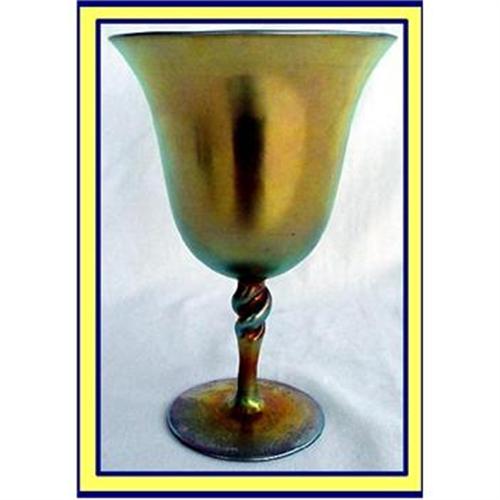 Signed Steuben gold aurene #L361 goblet with twist stem.<BR>Measures 6 1/4inches high.<BR>Round base leads to organic twisted stem beneath large campanille shaped goblet. Beautiful golden iridescence.<BR>Etched signature underneath STEUBEN AURENE 2361.<BR>Very good condition. No chips/cracks/restorations of any sort.