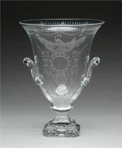 STEUBEN STRAWBERRY MANSION URN. Strawberry Manson urn was designed by Fredric Carder in 1931. An engraved goblet of the Federalist Period c.1790 was found in Painted Post, NY in the summer of 1931. Steuben copied the design for presentation to Strawberry Mansion an historic Philadelphia House restored in 1932. The pattern was subsequently produced for sale. SIZE: 12-3/4 in. t. CONDITION: Corners of base have been ground, otherwise very good. 5-61148