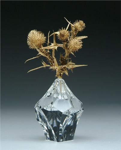 STEUBEN THISTLE ROCK SCULPTURE. Wonderful Steuben sculpture designed by James Houston features beautiful clear crystal cut and polished base holding a gold vermeil thistle. Each thistle is unique being a single casting from a fine summer specimen picked from a New England hillside. No two of Steuben's vermeil thistles are identical. Pictured on pg. 306 of the new Madigan book "Steuben Glass: An American Tradition in Crystal". SIZE: 8 in. t. CONDITION: Very good to excellent. 5-61143