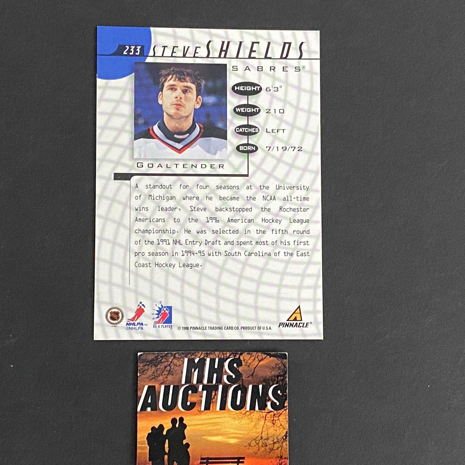STEVE SHIELDS 1998 PINNACLE BE A PLAYER AUTOGRAPHED HOCKEY CARD