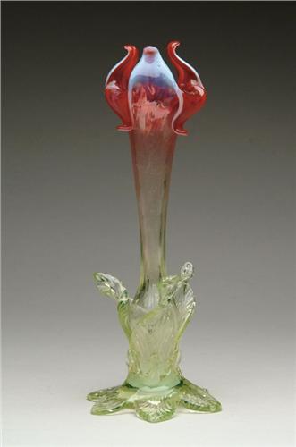 STEVENS AND WILLIAMS LILY VASE. Very unusual lily vase begins with a light green flower petal foot leading up to twisted leaves. Slightly bulbous vase extends from middle of leaves and shades to a rich cranberry at the top. Flower petals are highlighted with white opalescence. SIZE: 12 in. t. CONDITION: Very good to excellent. Collection of Dr. C. and Margaret Chastain 5-61436