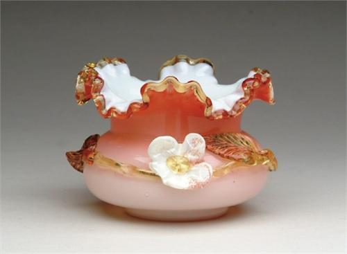 STEVENS AND WILLIAMS VASE. Lovely small vase has peach blow coloring with applied white flower on amber stem and leaves. Ruffled rim is decorated with a band of amber colored glass. SIZE: 3-1/2 in. t x 5 in. dia. CONDITION: Very good to excellent. Collection of Dr. C. and Margaret Chastain 5-61444