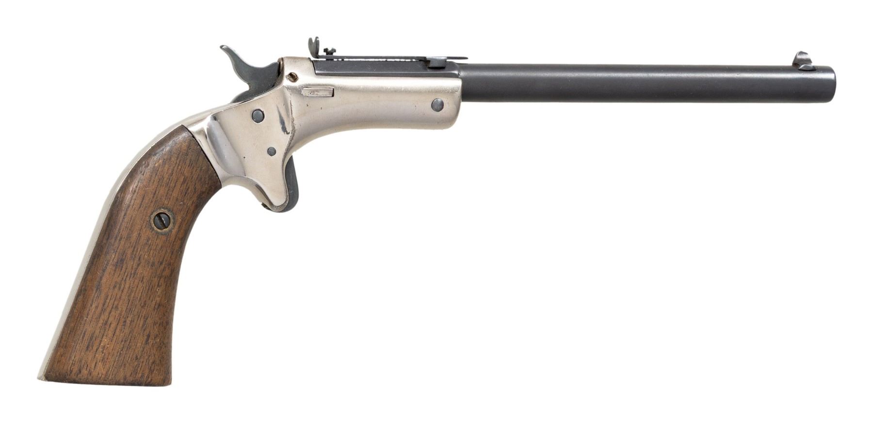 Cal. 22 RF (22 LR). S# 46077 (on frame under left grip panel. Matching 6" bbl. Replacement blade front sight w/ original notch adj. rear sight. Iron action w/ spur trigger & bushing firing pin; replacement release button. Two piece walnut grips. CONDITION: very good reblued barrel. Renickeled action. Fair worn grips. Very good rifling. (25-4903/MD). CURIO. $200-300.