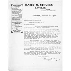 (1855 - 1934) American businessman, a baseball stadium concessionaire often credited for helping invent the expression "hot dog", he grew his small stand in Brooklyn's Polo Grounds into an international sports catering giant. Especially rare T.L.S. "Harry M. Stevens" on his catering company letterhead, 1p. 4to., Madison Square Garden, N.Y., Sep. 1, 1904 to Sen. Edgar Brackett. Stevens sends a sworn statement concerning a lawsuit involving the sale of domestic gamebirds as being imported. Stevens hopes that the trial will conclude soon, adding: "…the winter season at Madison Square Garden promises to be most strenuous. I have been subjected to a lot of joking by my friends…and the case has really created a lot of interest in catering circles…I am subject to your order at any time…" Very good.
