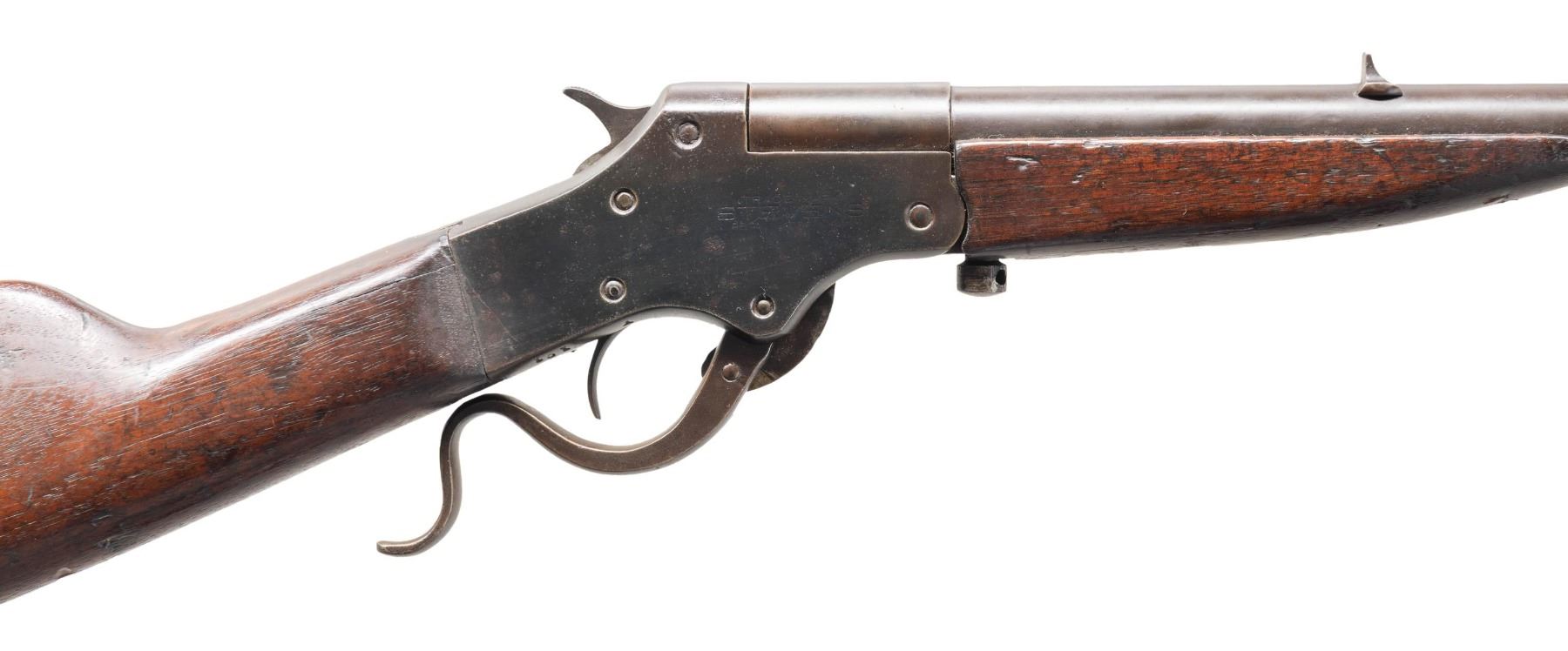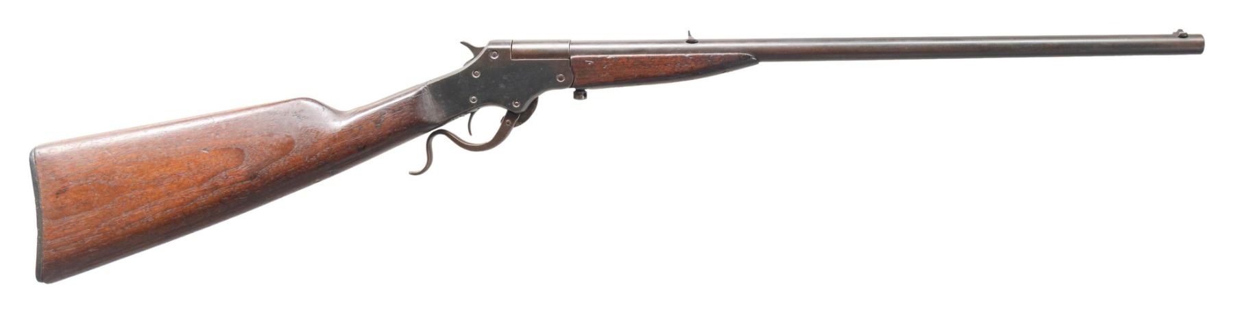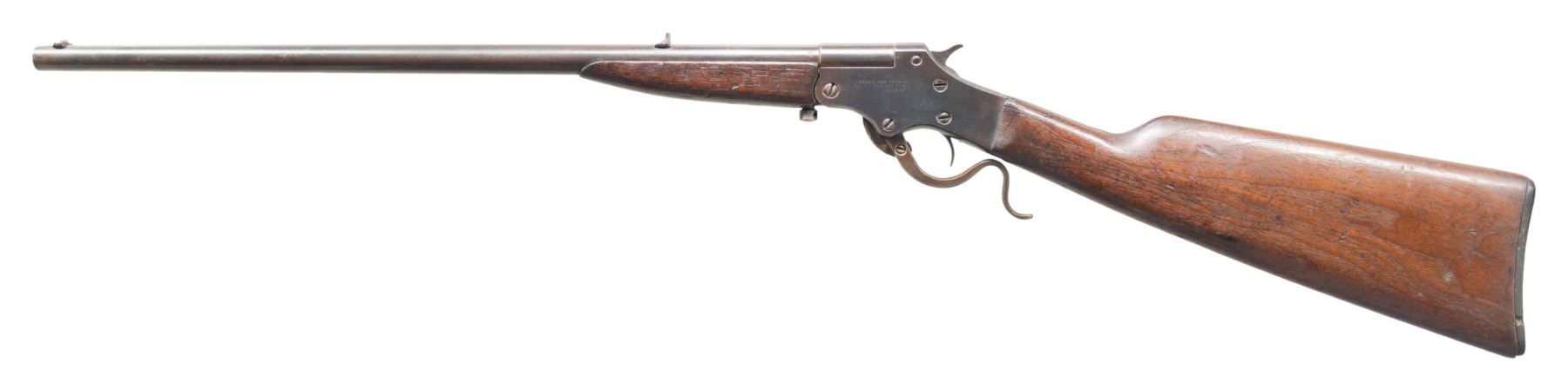 Cal. 25 Stevens. S# T101. Bbl. 20" rnd. Bead front sight that appears chipped at top. V-notch rear sight. Metal has old reblue finish. Hardwood stock. CONDITION: stock set has added varnish with a few cracks, some light chipping, dings, handling marks & worn finish. Metal is fading to gray overall with traces of an old reblue, oxidation, dings & varnish overrun. Action appears functional when hand cycled. Pitted bore. (25-5285/MJC). CURIO. $50-75.
