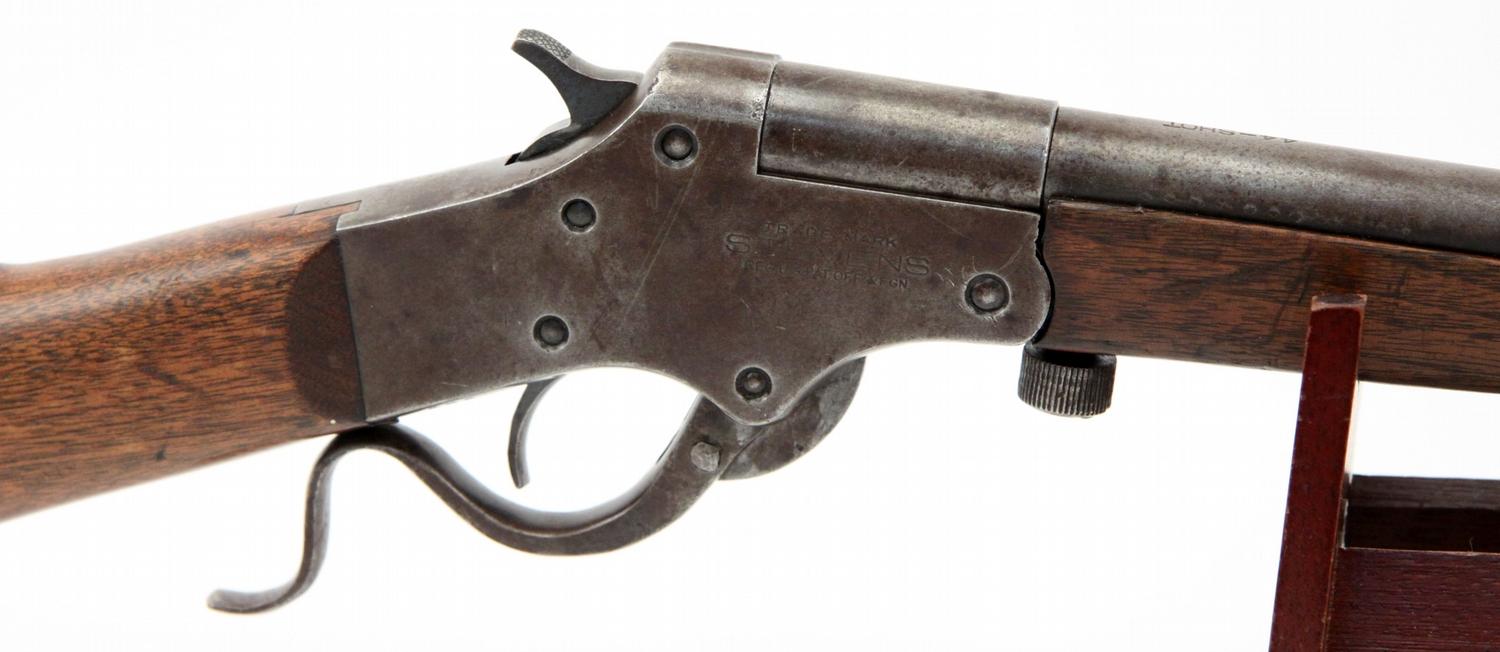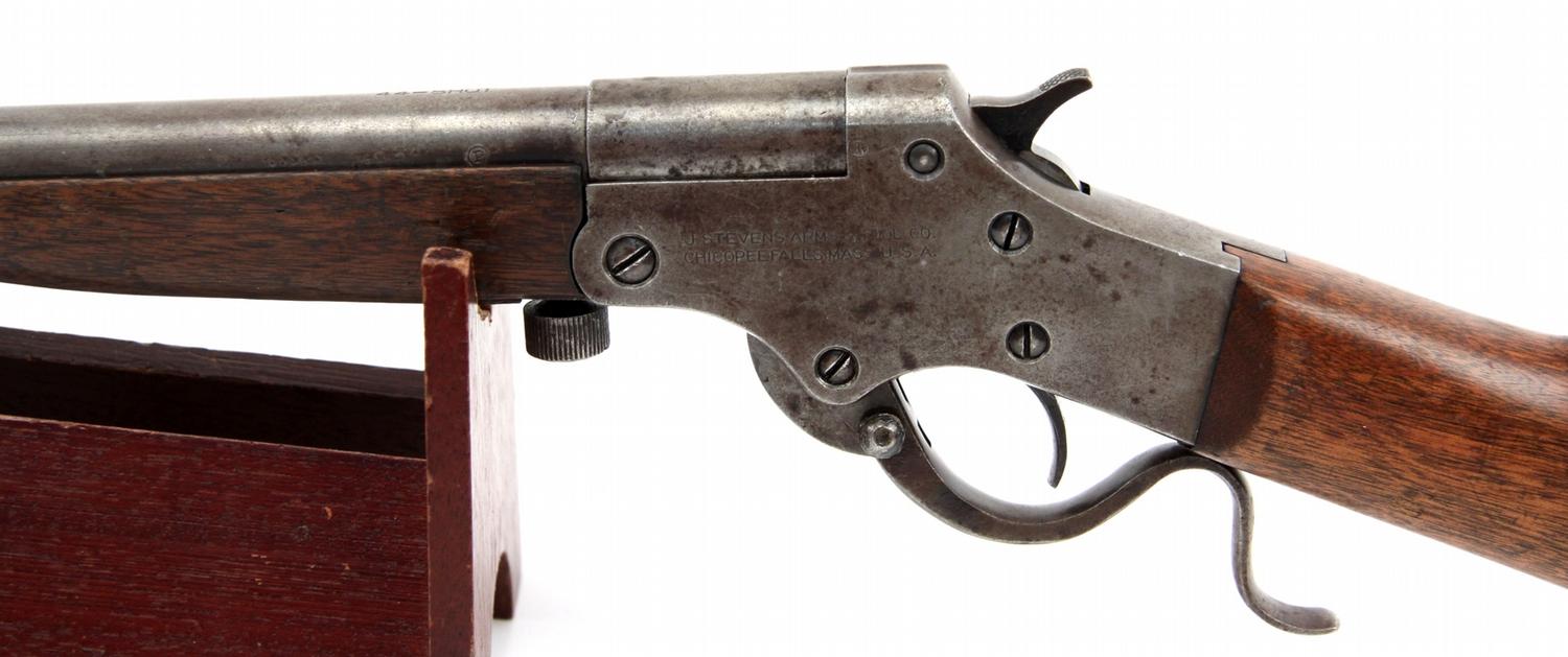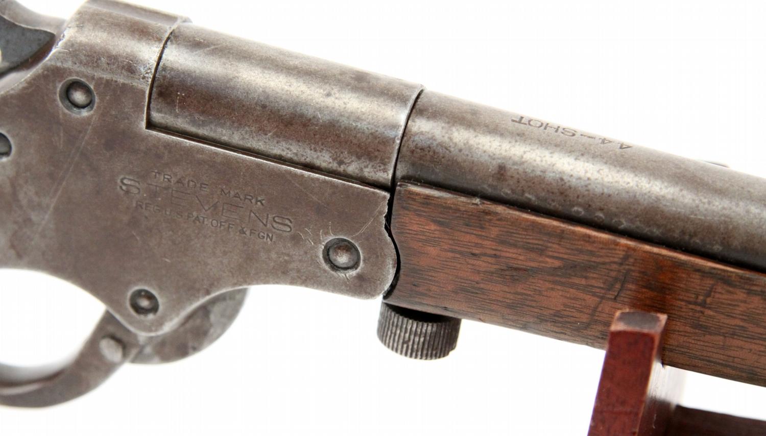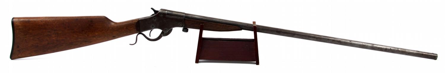 Stevens Model 101 single shot smoothbore, chambered for .44 XL Shot (not .410). Manufactured between 1014 and 1920. Trigger guard also releases breach. Gun appears not to be altered or fixed up. Bore is in good condition. Mellow patina over barrel and metal parts, and stock is in very good condition. Overall very good condition. SN: G583
