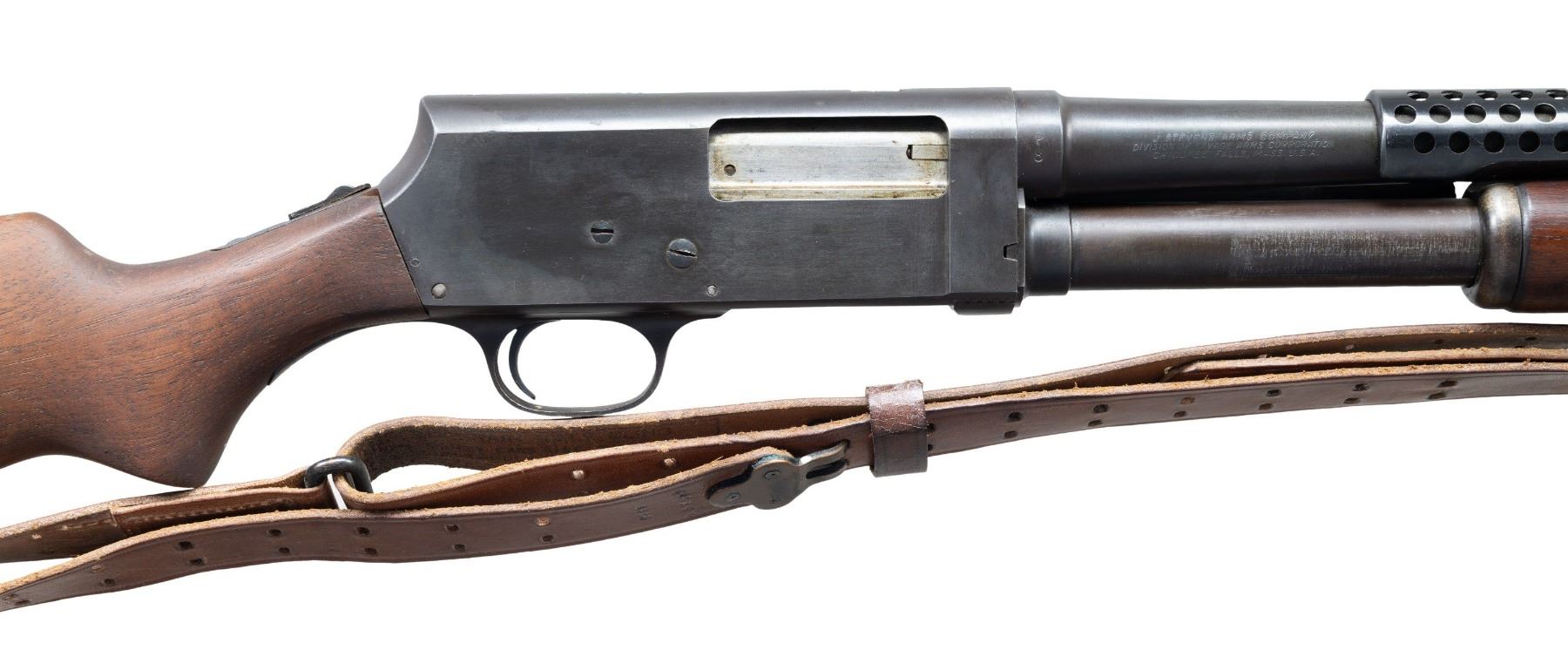 Cal. 12 GA, 2 3/4". S# 65291. Bbl. 20" with fixed Cyl. bore. Bright finished 6-row handguard, bayonet lug has proper plum coloration and brass front bead. Bbl. and action have a dull "brushed" blue finish that resembles parkerizing. Left side of receiver above the trigger is stamped "U.S./ CD" (possibly indicating Civil Defense issue). Forward portion of receiver has "P" proof mark over the flaming bomb ordnance mark. Top of receiver and bbl. have "P" proofs. Right side of bbl. has the "P" proof over the flaming bomb. Uncheckered rnd. forearm and pistol grip walnut stock with original buttplate. Front of pistol grip is stamped "R". Military leather sling on original swivels is marked "JAD & CO/ 1943" ("D" is stamped backwards).CONDITION: metal retains over 80% original metal finish showing light slide and carry wear. Forearm has lightly worn original finish. Refinished stock shows small handling marks. Sound action. Bore is generally bright showing small spots of pitting towards the muzzle. (25-4566/DS). CURIO. $3,000-5,000.