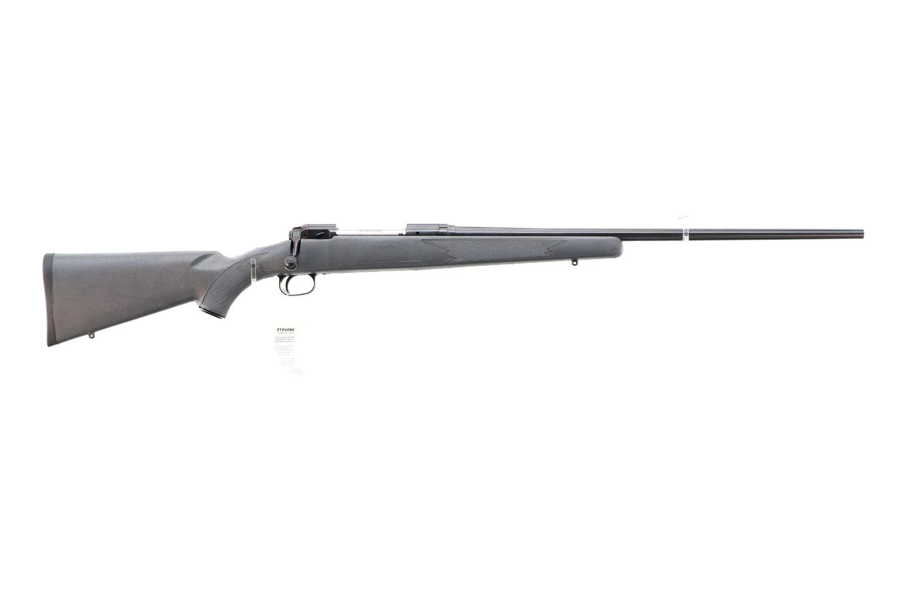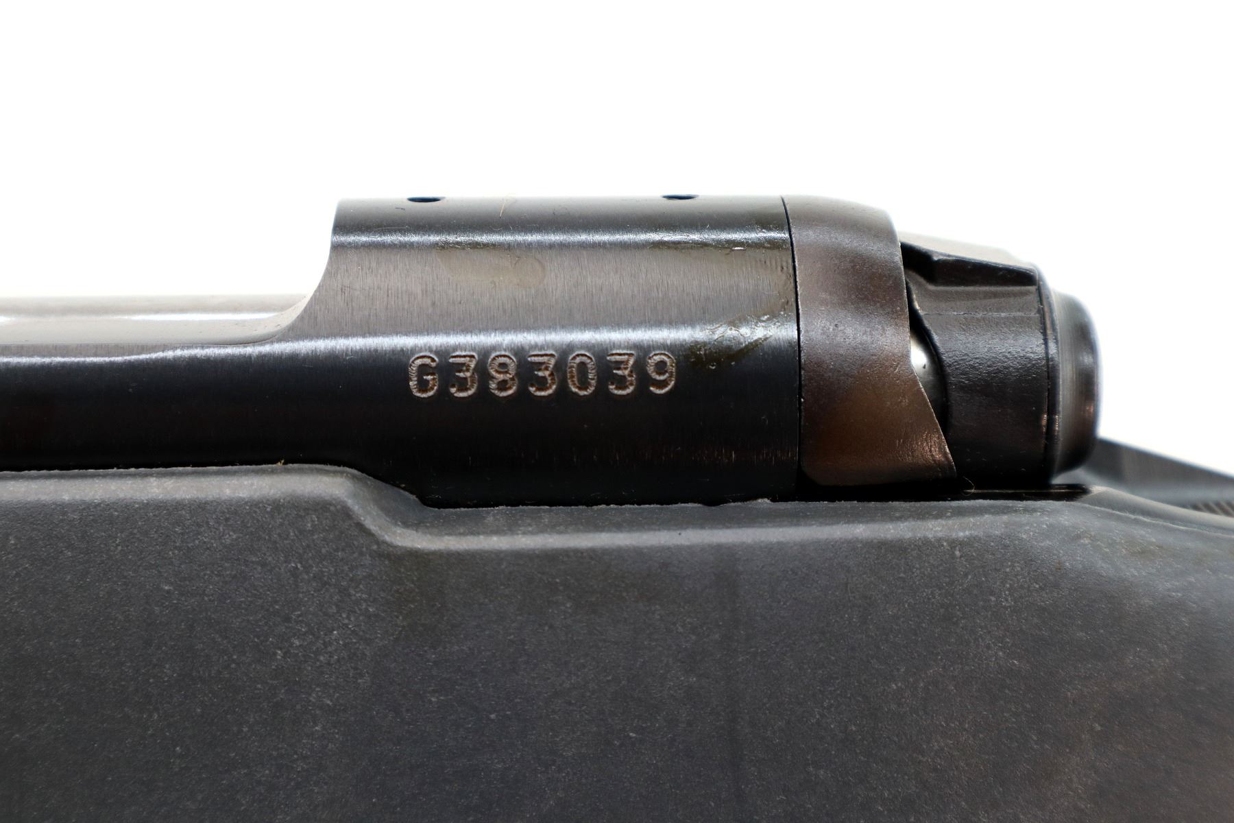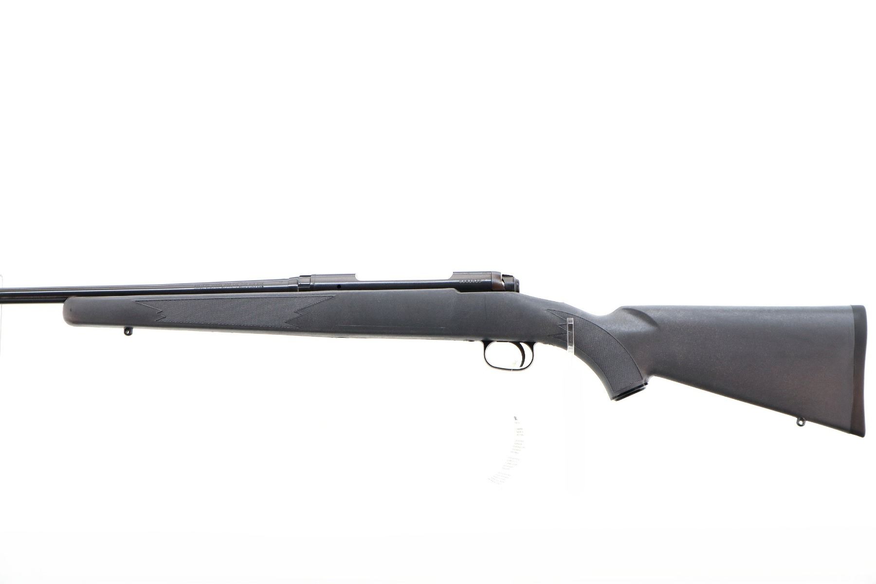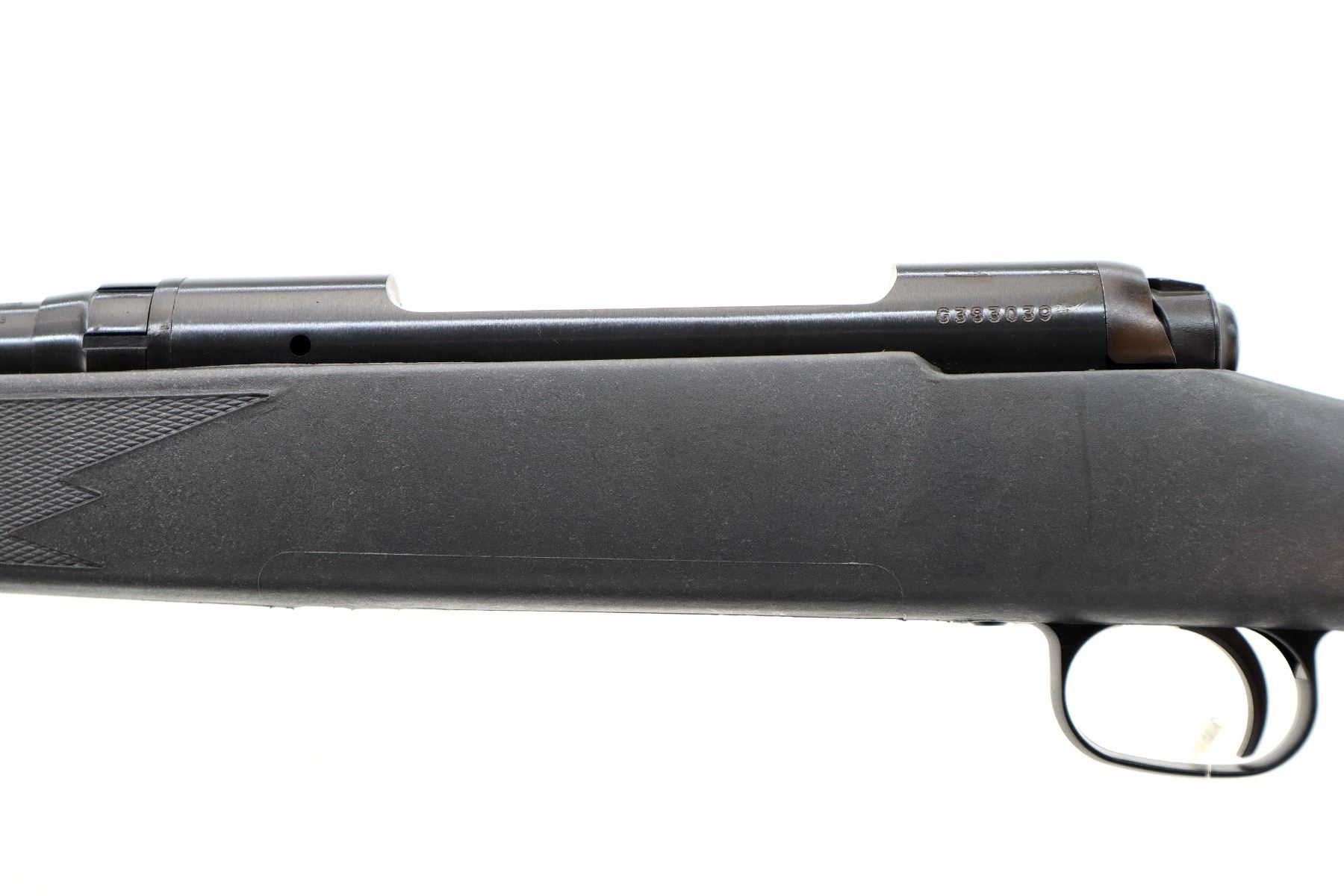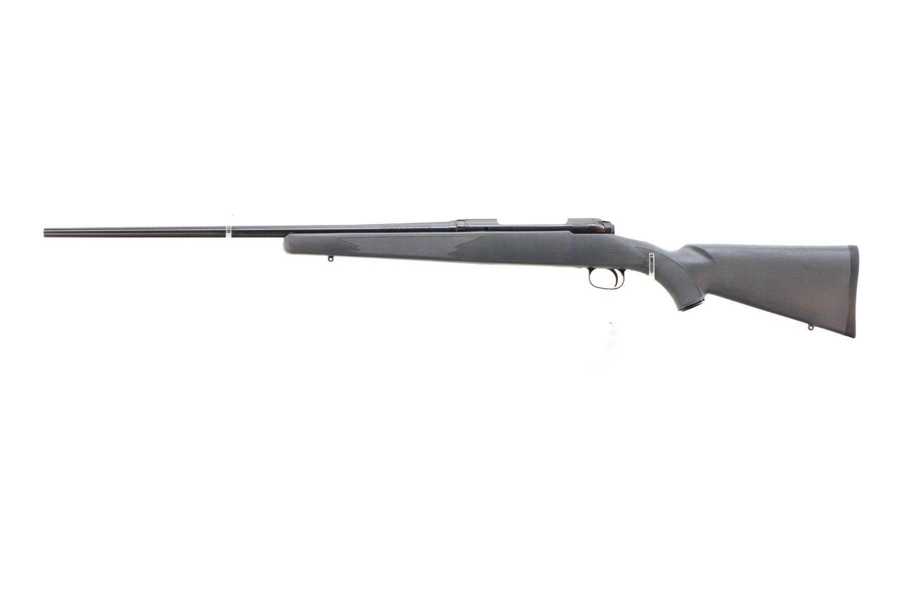 Main Description: No sights, blued finish, receiver drilled and tapped with no plug screws installed, checkered bolt knob. One piece grey synthetic stock, checkered forearm and pistol grip, black rubber recoil pad, grip cap, non accu trigger, swivel studs, retains factory hang tag.