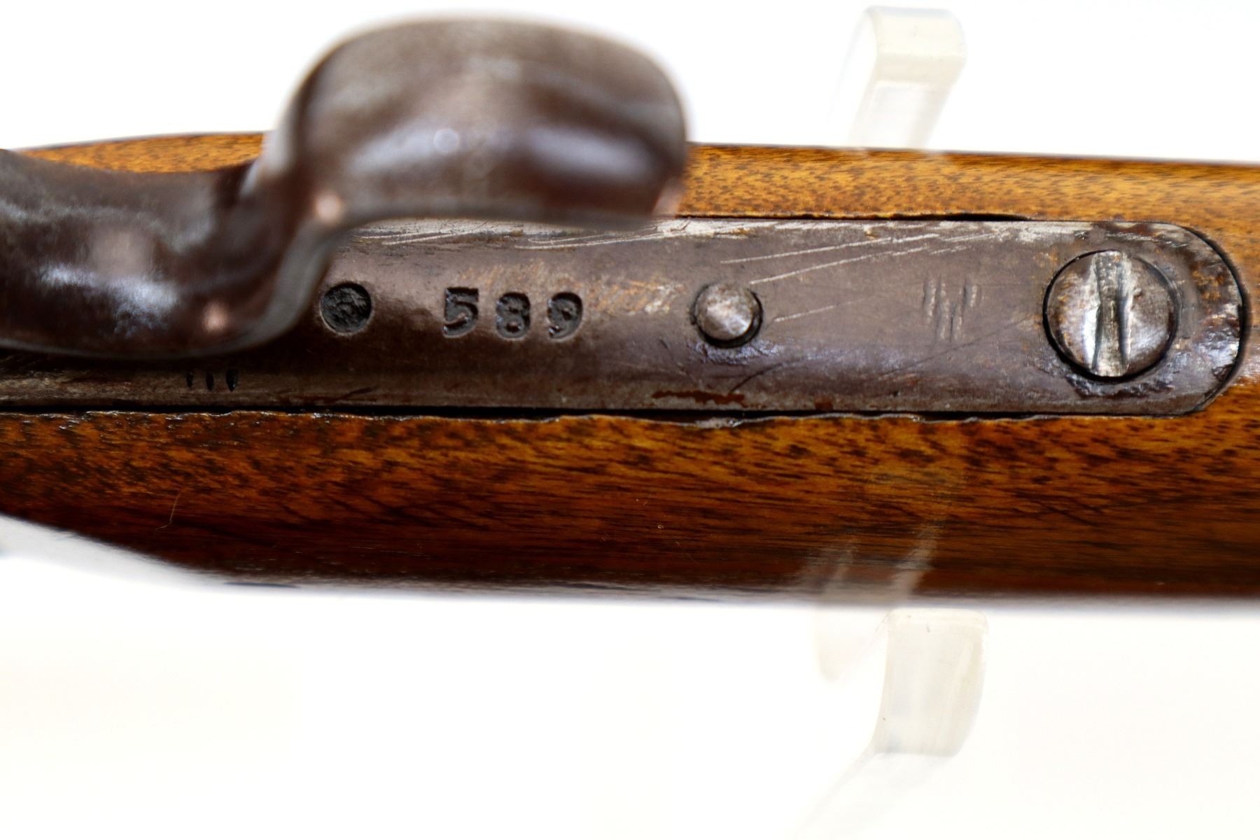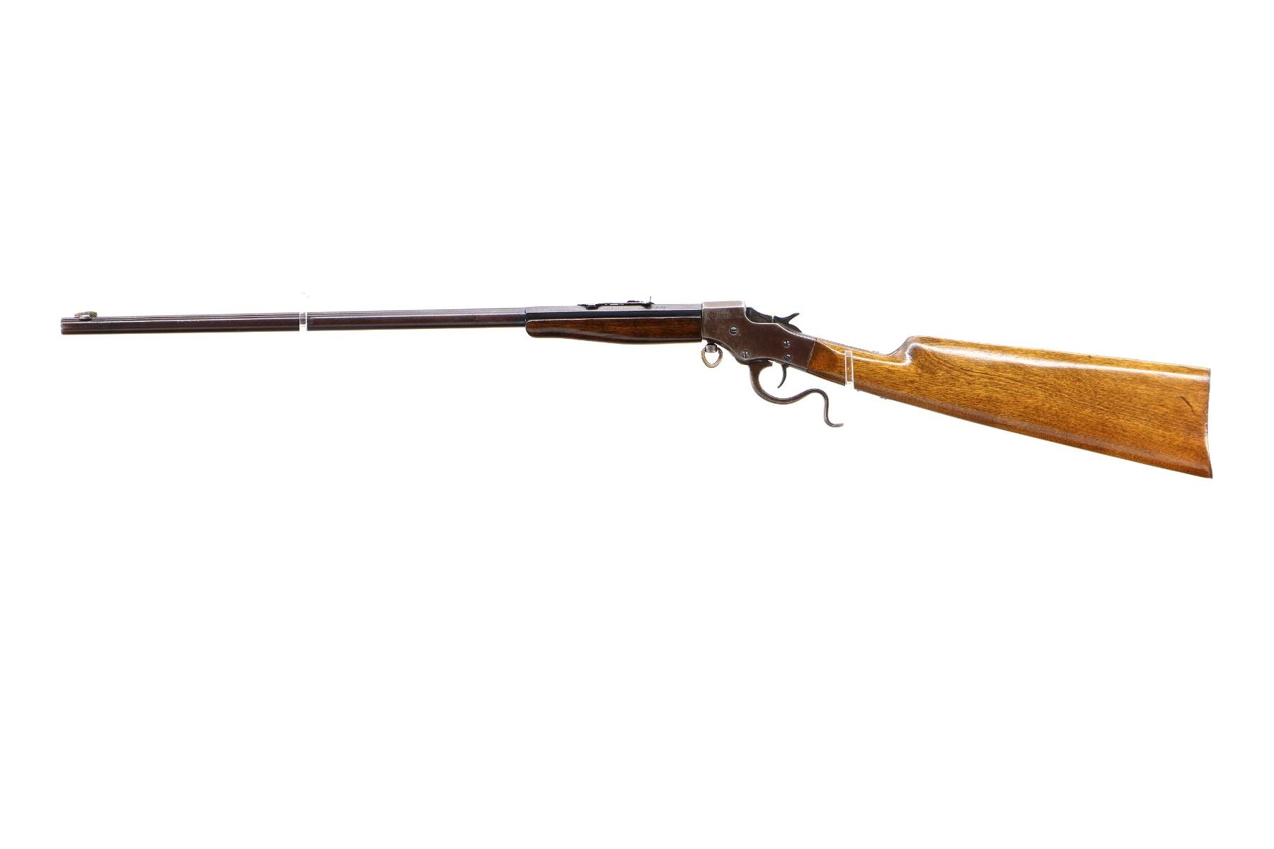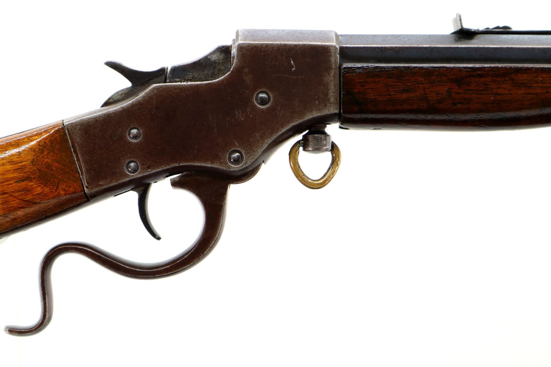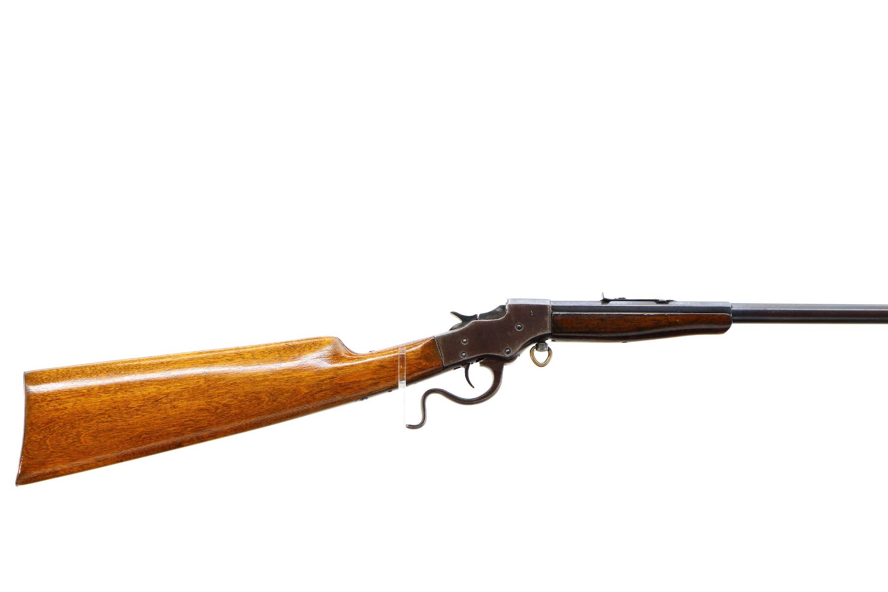 Main Description: Blade front sight, adjustable u notched rear sight, 1/3rd octagon, 2/3rd round barrel, checkered spur hammer, extractor is present. Two piece wood stock, straight grip, cracked behind upper and lower tangs, smooth steel butt plate, takedown ring replaced.