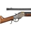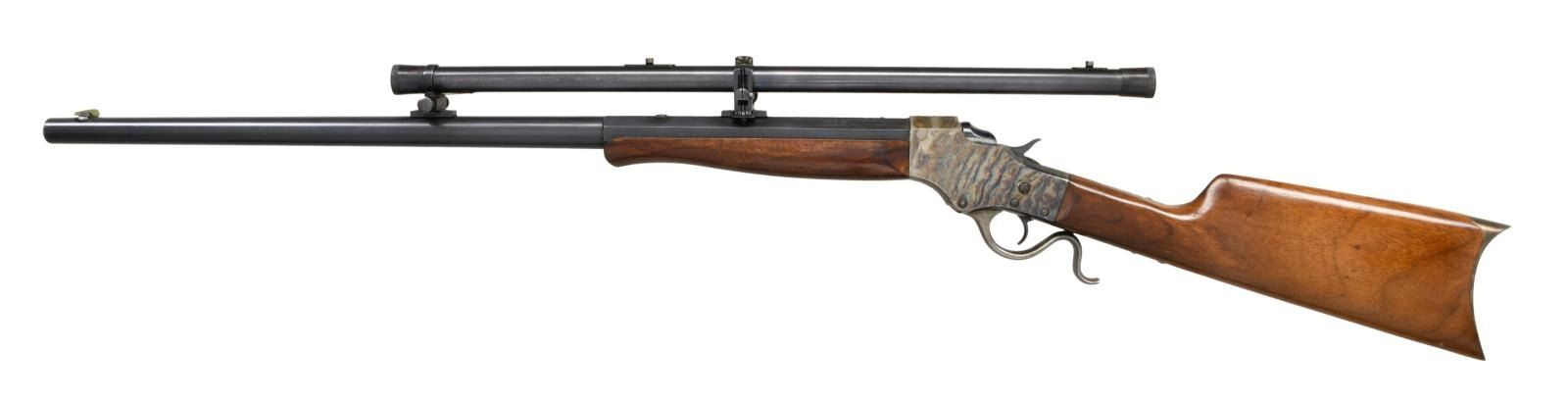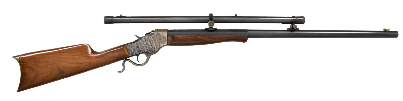 RIFLE WITH SCOPE. Cal. 22 LR. S# 9175. Bbl 26". No. 44 single shot target rifle chambered in .22 LR manufactured by Stevens A & T Co. Half octagonal barrel is stamped with Steven's 2 line address on the top flat, with the caliber designation on the left. Frame and lever are case color hardened, with the breechblock, hammer, and barrel being blued. Plain wood buttstock featuring a crescent buttplate, with a smooth wood forend. German silver front sight with dovetailed Marble's slot blank. Barrel is mounted with a WM Malcom scope. Matching numbers are present on the frame and barrel. CONDITION: frame retains vibrant case coloring, with some areas of fading and light wear. Lever retains a gray patina. Barrel retains bountiful amounts of its blue finish, exhibiting some light wear at the muzzle and some scattered superficial marks form handling and storage. Mirror bore, exhibiting well defined rifling throughout. Wood furniture exhibits some scattered marks and minor impressions from handling and storage, but is otherwise very good overall. Scope retains a clear optic. PROVENANCE: From the Harold Prucha Collection". (23-5018/MLW). CURIO. $1,500-2,000.