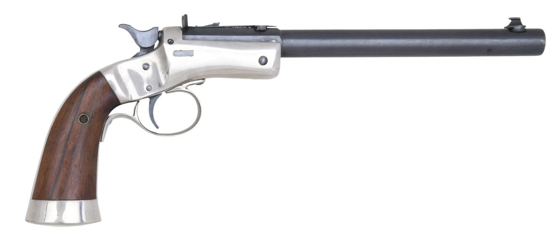 Cal. 22 LR. S# 29390 (on frame under grips). Mfg. 1907-1916. Matching numbered 8" barrel & 2 piece walnut grips. Bead front sight & elevator rear sight. CONDITION: Very good blue & nickel finish showing light marks & wear along pivot pin. Very good wood finish. Very good bore. (24-4860/MD). CURIO. $400-600.
