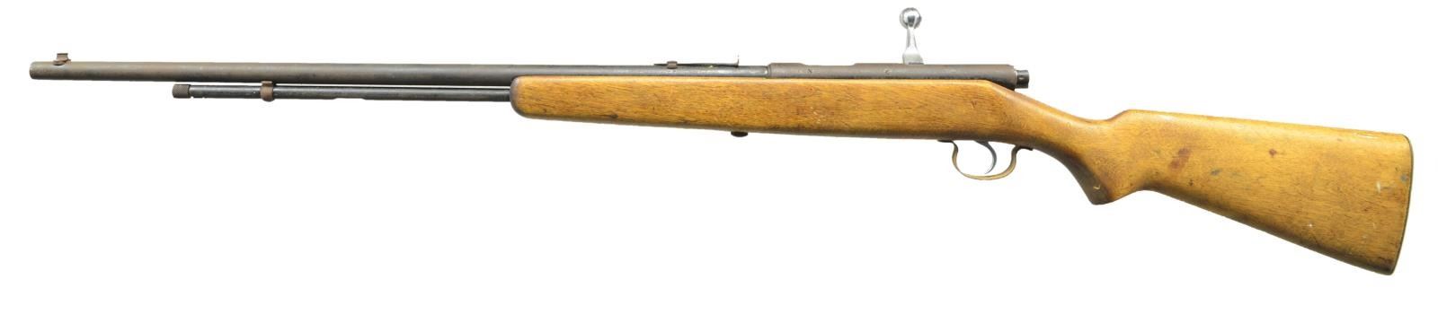 Cal. 22S / L / LR. S# NSN. Bbl.24" Tube fed, bolt action, rimfire rifle. Blade front & elevation adjustable rear sights, missing elevator. Drilled & tapped receiver. Full length hardwood stock w/ flat metal butt plate. CONDITION: Entire surface of exposed metal parts are covered w/ a patina, somewhat aggressive on some spots. Dark bore w/ visible rifling. (22-3238/JZ). CURIO. $30-50